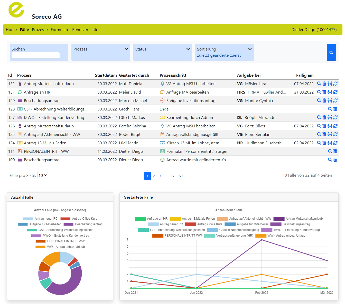 Das Dashboard zeigt sämtliche Aufgaben und deren Status im Detail auf: Prozessname, Datum der Erfassung, durch wen wurde dieser Prozess eingeleitet, wo steht der Prozess aktuell und bei wem ist die Aufgabe noch offen, plus das Fälligkeitsdatum. Auf diese Weise behalten Sie immer den Überblick und kein Formular resp. keine Anfrage geht verloren oder vergessen.