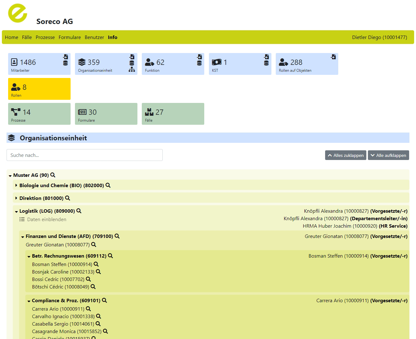 Nebst den gängigen Elementen mit freier Eingabe hat Max B. Eigenschaften aus den Unternehmensdaten zur Auswahl. Diese Daten übernehmen dasselbe Rollenkonzept wie die Aufgabenzuweisungen und stellen sicher, dass beispielsweise ein Vorgesetzter nur aus den ihm unterstellten Mitarbeitenden auswählen kann.